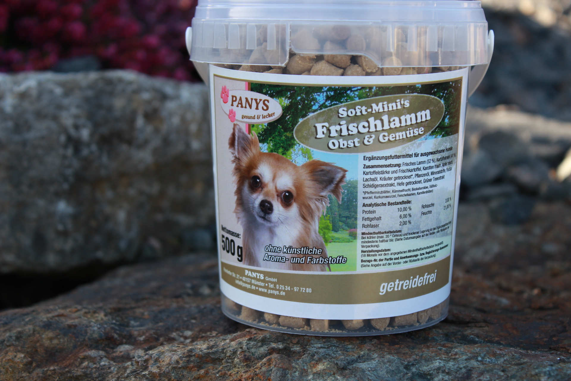 Leckerchen mit Frischfleisch!„Ausgewogen und Lecker“ ist das Motto von PANYS. Wir halten für Ihre Lieblinge Futter und Leckerchen in bester PANYS Qualität bereit. Auf Lockstoffe wie Zucker oder Nikotin haben wir selbstverständlich verzichtet, denn unserer Meinung nach, haben diese in Tiernahrung nichts zu suchen. Soft-Mini`s Frischlamm, Obst u. Gemüse sind Trainees mit Frischfleisch in einer getreide- und glutenfreien Rezeptur. Für ernährungssensible Hunde aufgrund des Singleproteins bestens geeignet. Künstliche Aroma- und Farbstoffe kommen bei den Soft-Mini`s Frischlamm, Obst u. Gemüse nicht in die Tüte. Also viel Spaß beim Training und ihrem Liebling guten Appetit! Sollte ihr Hund die Abwechslung lieben, haben wir mit acht verschiedenen Geschmacksrichtungen auch daran gedacht. Ein zufriedenes, glückliches Tier ist doch das, was uns allen am Herzen liegt. Die einzige Frage die sich hier stellt, „Welche Geschmacksrichtung mag mein Liebling am liebsten?“ Bei acht verschiedenen Geschmacksrichtungen fällt die Wahl oft schwer. Dafür haben wir die Soft-Mini`s Frischlamm, Obst u. Gemüse in 200 g Beutel verpackt. So hat Ihr Liebling die Möglichkeit alle Sorten einmal auszuprobieren. Wenn Sie wissen, welche Sorten bevorzugt werden, empfehlen wir die 450 g im wieder verschließbaren Eimer.